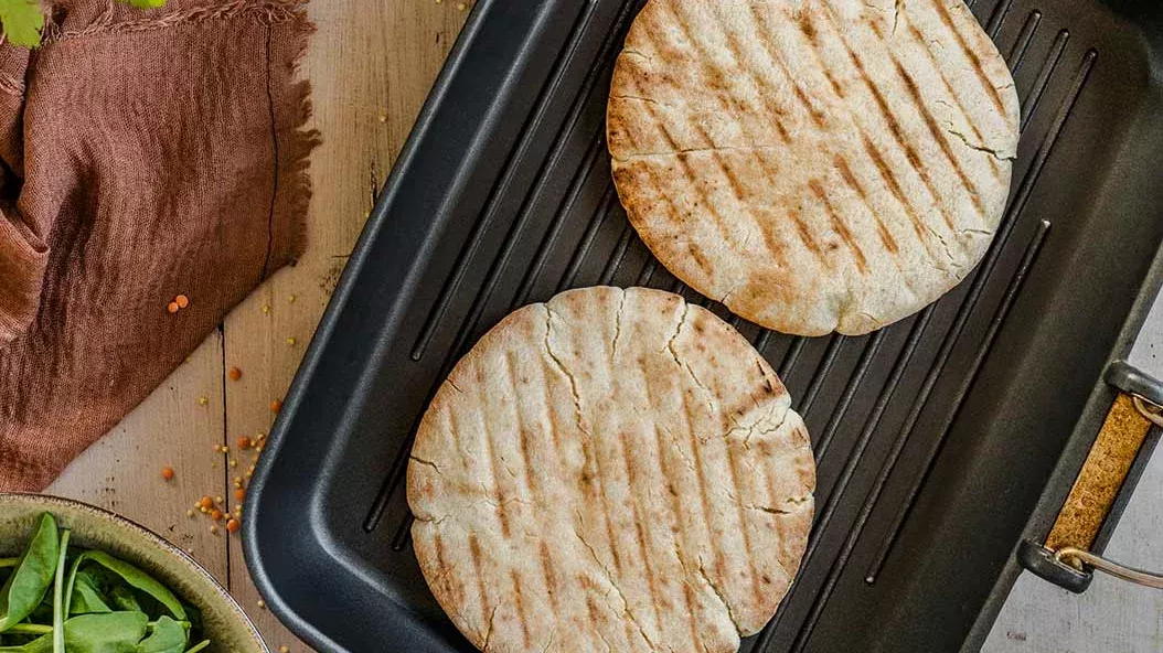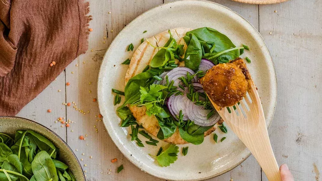 Want a tasty lunchtime snack? These pitta breads are loaded with herby spinach salad and crisp lentil patties. Suitable for vegans.