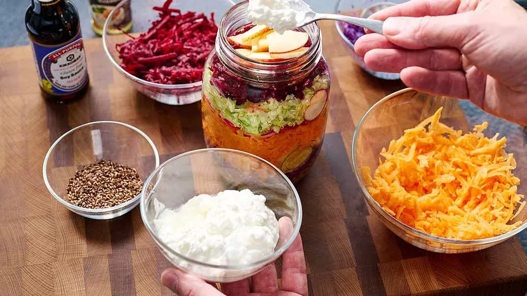 Layer the salad in a tall glass jar as follows: dressing, red cabbage, apple, carrot, radish, spring cabbage, beetroot, pear, cream cheese and linseeds. Close the jar and shake briefly before serving to distribute the dressing. Alternatively, serve the salad in bowls.