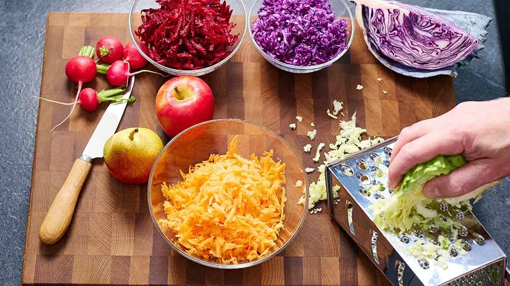 Roughly grate the spring cabbage, red cabbage, beetroot and carrots separately in a processor. Slice the radishes, and cut the apple and pear first into wedges and then into slices.