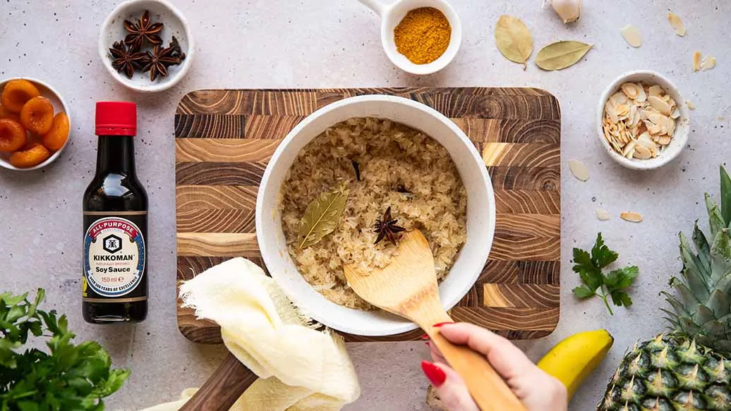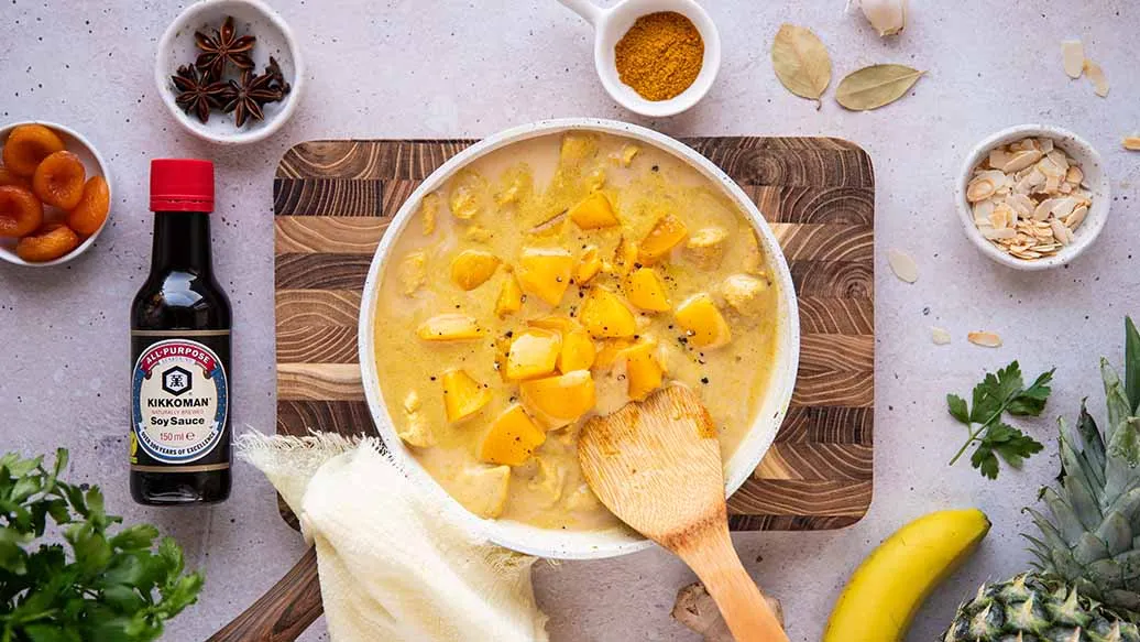 Riz Casimir, a curry dish from Switzerland, combines tender chicken, gentle spices and sweet fruit. A splash of Kikkoman Soy Sauce adds depth and savoury flavour. Served warm, it’s a comforting, well-rounded dish.