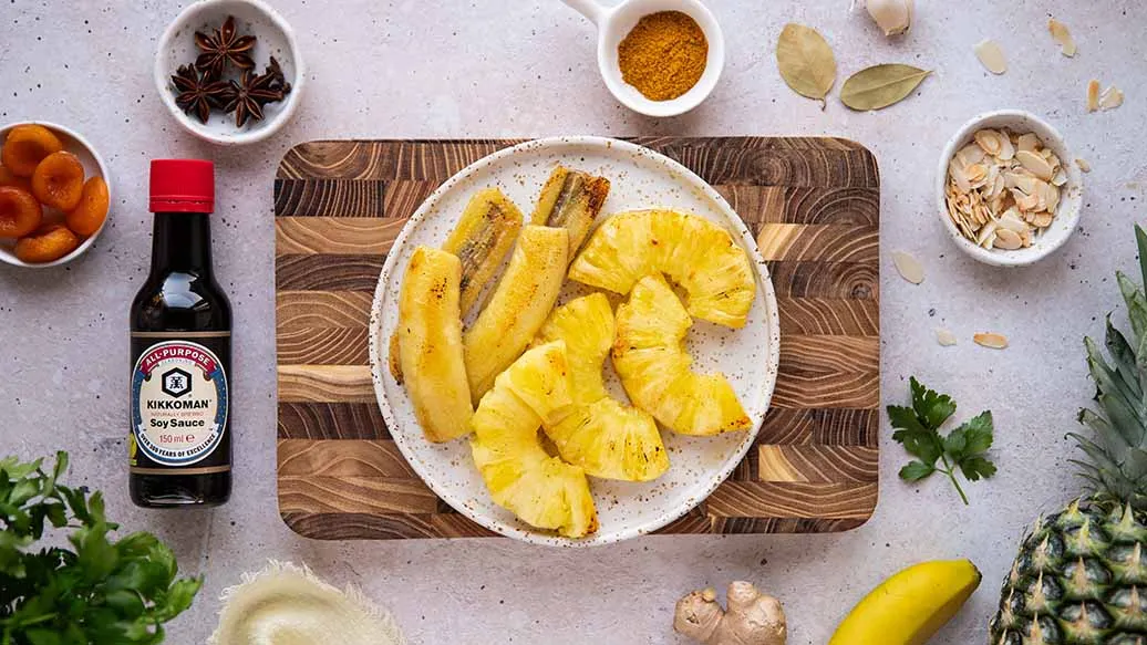 1 tbsp rapeseed oil – 60 g shallots, diced – 1 tsp ginger, grated – 300 g chicken breast, diced – ½ tbsp curry powder – 10 g butter – 10 g wheat flour – 70 ml chicken stock – 70 ml double cream – 50 ml syrup from tinned peaches – 1 ½ tbsp Kikkoman Naturally Brewed Soy Sauce – ¼ tsp black pepper, freshly ground – 100 g tinned peaches, diced – 10 g almond flakes, toasted – 1 tbsp parsley, chopped