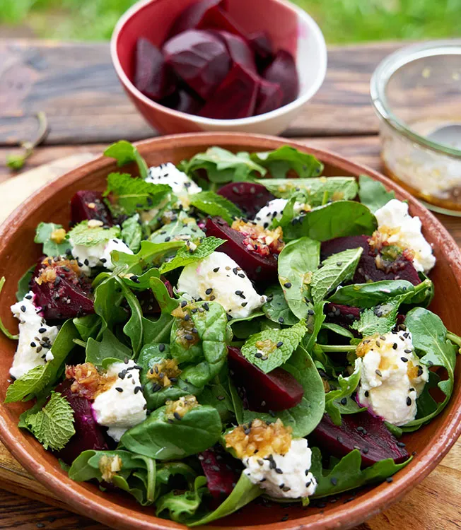 Cut the roasted beetroot into wedges and arrange on a plate. Break the ricotta into small pieces and add on top, then scatter over the rocket and spinach. Drizzle with the dressing, garnish with the mint leaves and sprinkle with the sesame seeds.