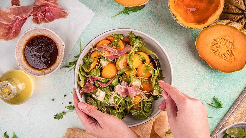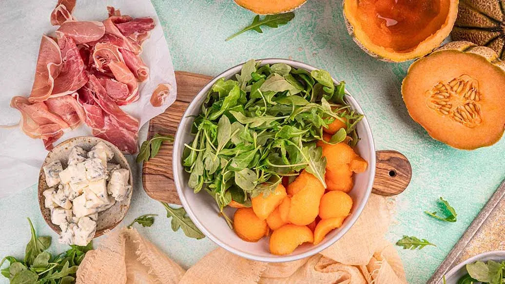 Cut the gorgonzola into chunks and tear the prosciutto into smaller pieces. Wash and dry the rocket. Add everything to the bowl with the melon and toss gently.