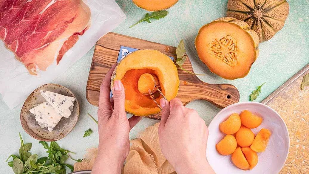 Cut the melon in half and scoop out the seeds. Use a melon baller to make balls of flesh or cut it into cubes. Transfer the melon to a bowl.