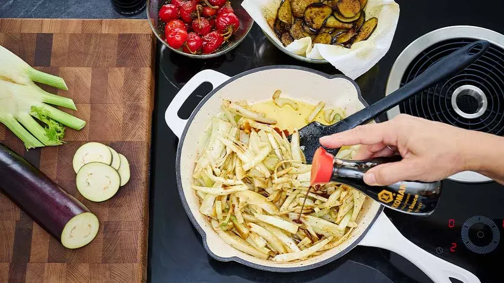 100 g small round red peppers (fresh or pickled) – 1 fennel bulb – 1 Japanese aubergine – 2 tbsp olive oil – 3 tbsp Kikkoman Naturally Brewed Soy Sauce – ¼ tsp freshly ground pepper
