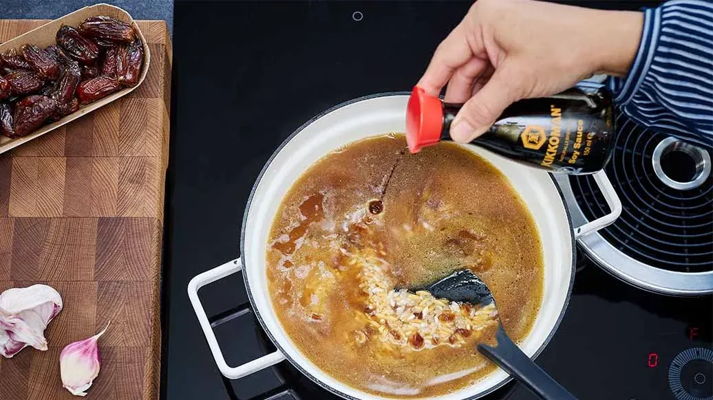 1 tbsp butter – 1 tbsp olive oil – 100 g orzo pasta – 4 dates – 1 garlic clove – 200 g medium-grain rice (e.g. Baldo or Calrose) – 400 ml lamb stock – 3 tbsp Kikkoman Naturally Brewed Soy Sauce