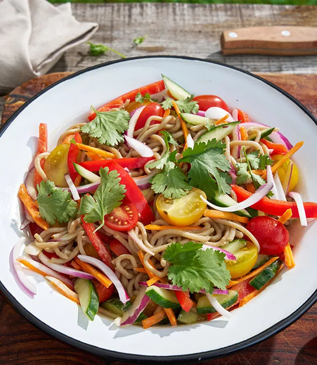 Soba noodles with crunchy vegetables and an aromatic dressing of Kikkoman Soy Sauce and tahini—a light and refreshing salad, ideal for lunch.