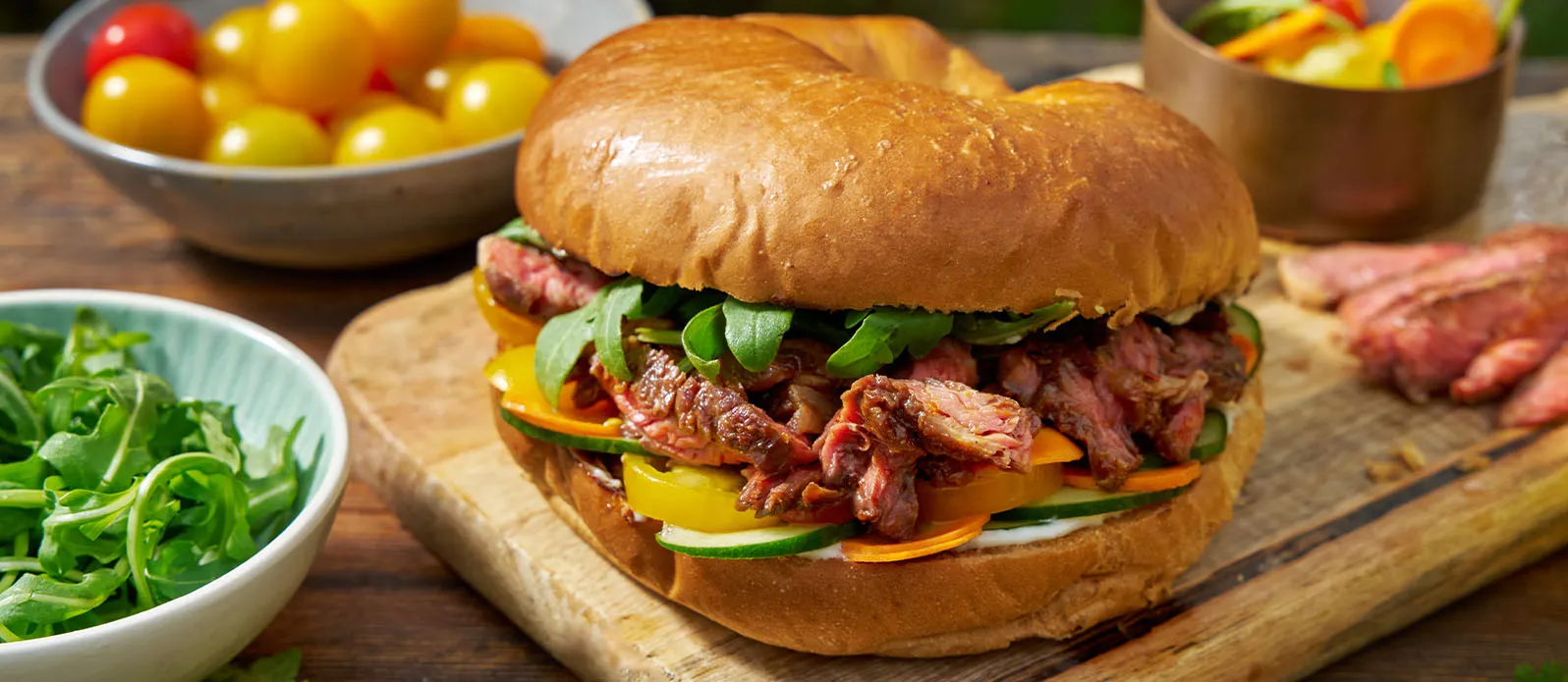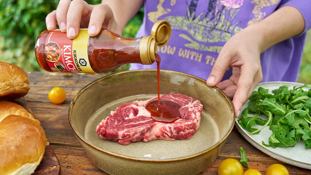 Juicy marinated beef in Kikkoman Kimchi Chili Sauce, served in a brioche-style bun with crunchy pickles, tomatoes and rocket.