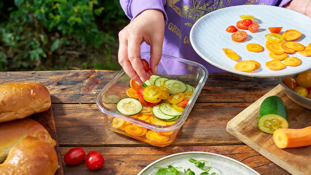 Cut the cucumber and peeled carrot into thin slices and slice the cherry tomatoes. Then mix with the vinegar and honey and leave to marinate for at least 15 minutes.