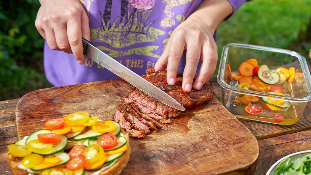 Marinate the beef in the Kikkoman Kimchi Chili Sauce for 15 minutes, then fry or grill for 3–4 minutes on each side. Cut the beef into thin slices.
