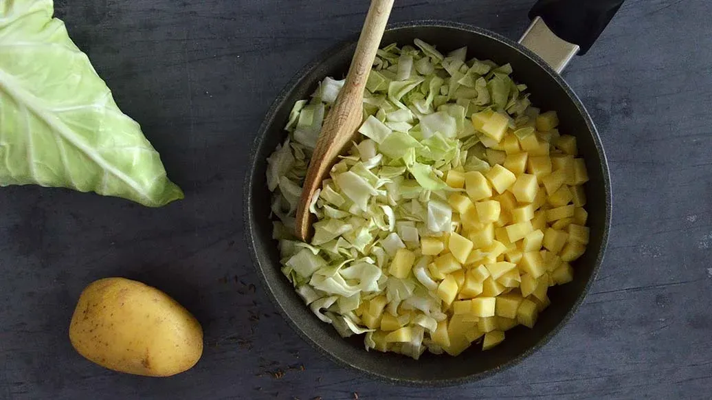 Dice the cabbage and potatoes into 1 cm pieces. Chop the garlic. Put the garlic and olive oil in a pan and gently fry.