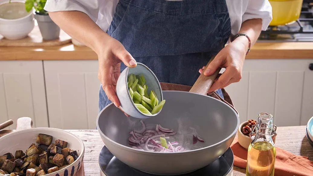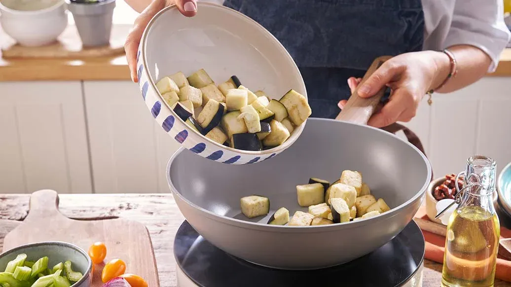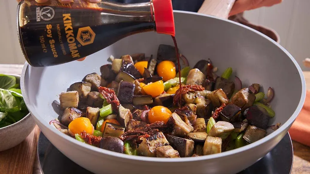 A vibrant stir-fry recipe bursting with Mediterranean flavours—smoky aubergine, sweet tomatoes and aromatic basil enhanced by the deep umami of Kikkoman Soy Sauce.