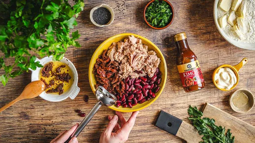 Drain the tuna and blend it with the beans and sun-dried tomatoes into a slightly chunky paste. Mix in the parsley and Kikkoman Kimchi Chili Sauce.