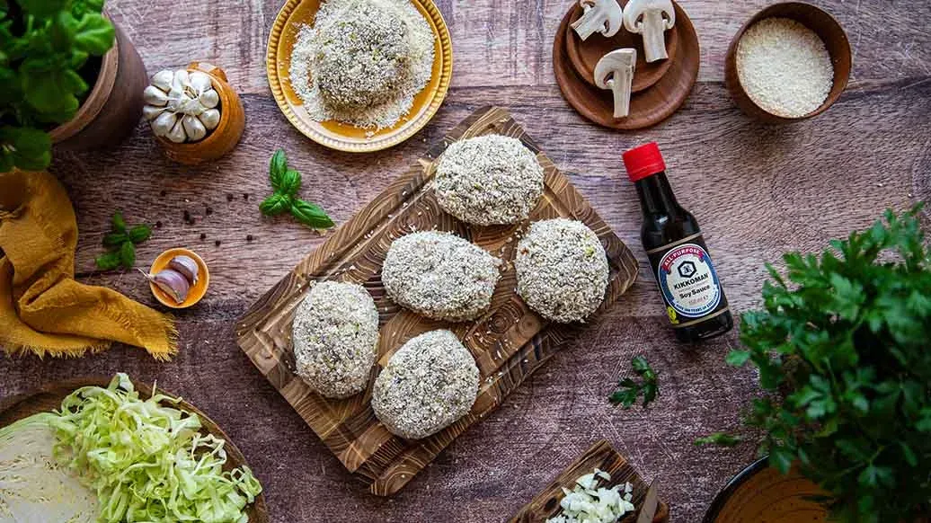 Finely dice the onion and mushrooms and fry them in heated oil in a pan. Leave to cool and transfer to a bowl. Shred the cabbage in a food processor and add it to the bowl. Add the rice, mince, egg, Kikkoman Panko, chopped garlic, Kikkoman Soy Sauce, marjoram and seasoning. Mix until well combined.