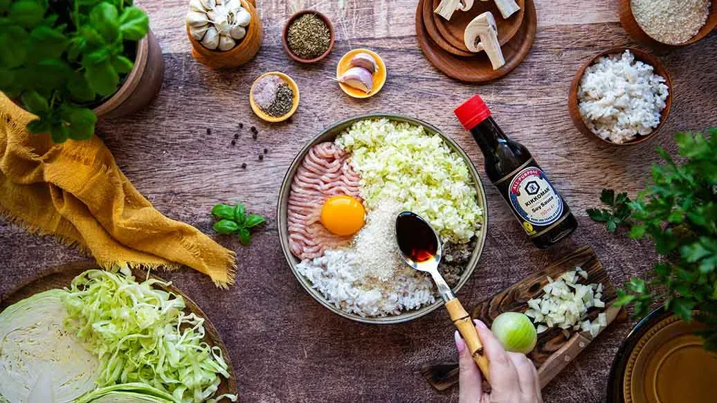 1 small onion – 100 g button mushrooms – 2 tbsp rapeseed oil – 170 g white cabbage – 150 g cooked basmati rice – 200 g minced chicken – 1 medium egg – 4 tbsp Kikkoman Panko - Japanese style crispy bread crumbs – 2 garlic cloves – 2 tbsp Kikkoman Naturally Brewed Soy Sauce – 2 tsp dried marjoram – 0.33 tsp black pepper – 0.33 tsp salt