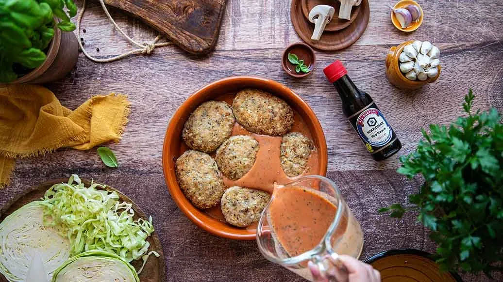 Mix the tomato passata with water, Kikkoman Soy Sauce, cream, sugar, herbs and pepper. Pour the prepared sauce over the cabbage patties and place the dish in a preheated oven at 180 °C (top and bottom heat). Cover and bake for 30 minutes, then uncover and bake for a further 15 minutes.