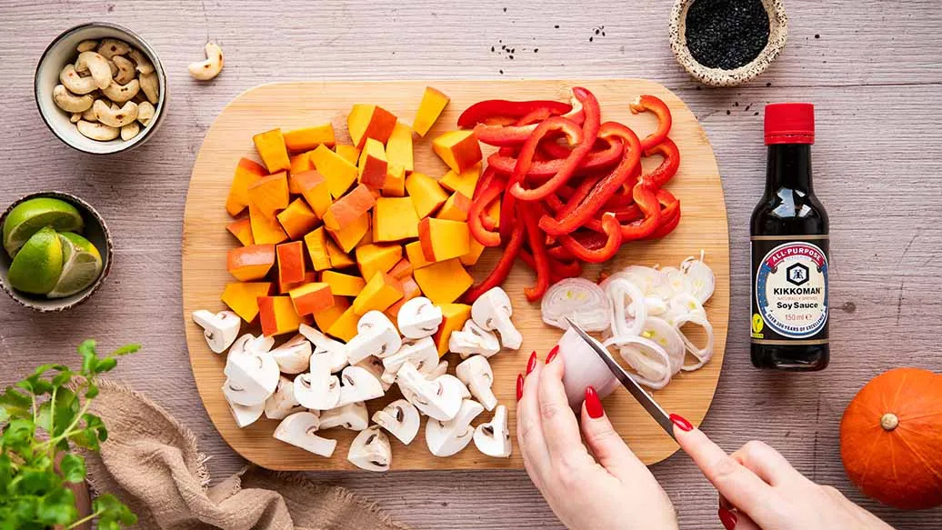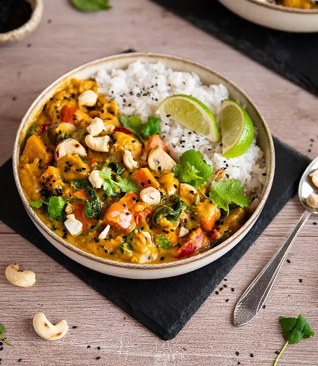 Heat the rapeseed oil in a saucepan, add the shallot wedges and sauté briefly. Add the pumpkin, mushrooms and red pepper and cook until slightly softened. Stir in the curry paste and fry for about 1 minute. Pour in the stock, coconut milk and Kikkoman Soy Sauce, then add the peanut butter. Cook until the vegetables are tender. Stir in the spinach and the juice of half the lime and heat briefly.