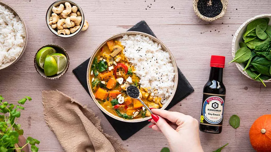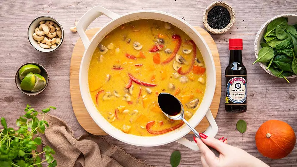 A mild vegan green curry with pumpkin, spinach and mushrooms. Coconut milk gives it richness, while Kikkoman Soy Sauce adds umami depth. Light but satisfying and straightforward to prepare.